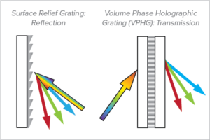The article begins with a short history of how gratings are used to separate light and then details the different types of diffraction gratings and the different manufacturing processes used by the leading gratings manufacturers, including Wasatch Photonics. A distinction is made, by Hogan, between the conventional reflection or surface relief gratings, which have ruled lines or groves on the surface vs. Volume Phase Holographic (VPH) transmission gratings, which we offer. Our unique, proprietary, and patented design technologies surmount many of the drawbacks of conventional reflection gratings by imaging a periodic structure of high and low index of refraction into dichromated gelatin hermetically sealed between two optical windows. While other manufacturers are striving to surpass the typical surface relief ruled gratings with 300, 600, 1200 or 2400 lines per millimeter, we work at UV, VIS, & NIR wavelengths with line frequencies of 150-5000 lines/mm.