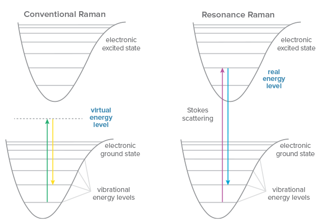 Conventional Raman scattering is a very weak phenomenon, and one that occurs to some degree regardless of the excitation wavelength used. If the energy of the excitation laser happens to coincide with an electronic transition within the molecule under study, however, the signal may be enhanced by a factor of 102-106, a technique known as resonance Raman spectroscopy. Even excitation close to the electronic transition of a molecule can yield ‘pre-resonance’, generating 5-10x more signal. Resonance Raman allows for faster measurements with better signal to noise ratio, and permits measurement of lower concentrations or even trace detection.