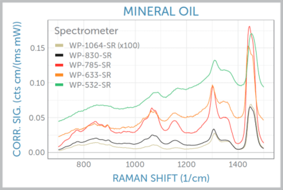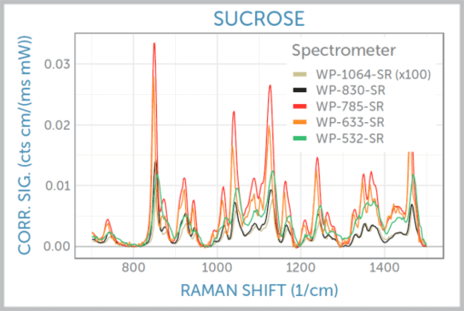 The choice of excitation wavelength is key in designing a Raman experiment, with the material of interest determining the optimal laser choice. This can be seen here, with 785 nm excitation delivering the most signal for sucrose, and 1064 nm excitation leading to the lowest fluorescence background in mineral oil.