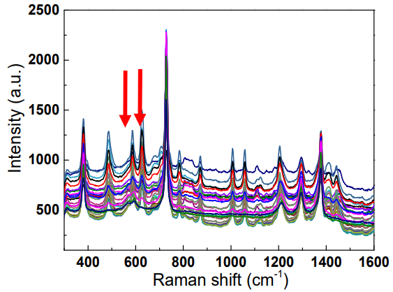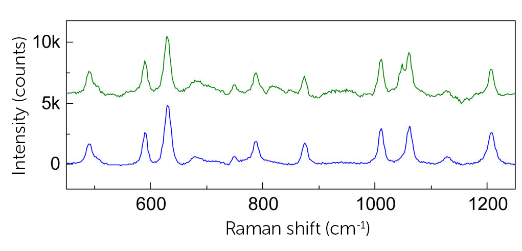 As can be seen by looking at the processed spectra of clinical MSU crystals (green spectrum) vs synthetic MSU crystals (blue spectrum), for highly concentrated samples, most peaks (491, 590, 631 cm−1, etc.) could be recovered after the background correction and subtraction of the polypropylene spectrum. In this application, the main MSU associated peaks at 590 and 631 cm−1 and CPPD associated peak at 1050 cm−1 are sufficient for confirming the existence of crystals