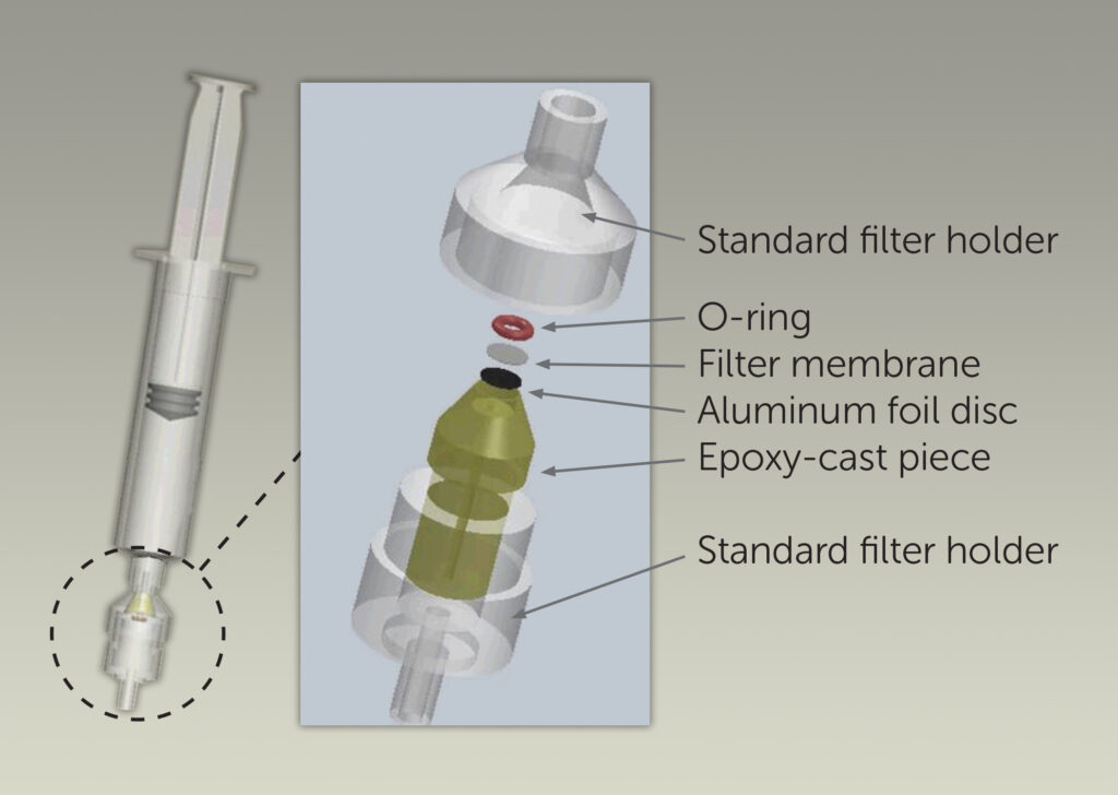 Following the filtration, the filter cartridge is removed from the syringe and inserted in the POCRS instrument to position the spot containing crystals at the focal point for Raman analysis.