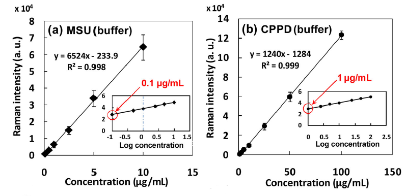 Given that clinical samples are reported anecdotally to be in the range of 10-100 μg/mL, the measured limit of detection of the POCRS system is well below the clinically relevant concentration in both cases. This bodes well for the ability of the technique to detect crystal-related arthritis more sensitively than current techniques, and at an earlier stage.