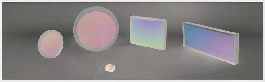 While many of our standard gratings are available as 25 or 50 mm diameter rounds, we also provide square and rectangular gratings for pulse compression, spectroscopy, and astronomy. VPH transmission gratings can be produced in volume as small as 10×10 mm, and smaller for special projects. At the opposite extreme, we can image large format gratings up to 300 mm in dimension for astronomy, large imaging arrays, and hyperspectral spectrographs (larger upon request).
