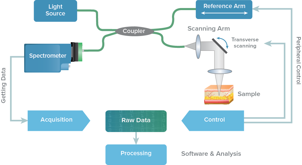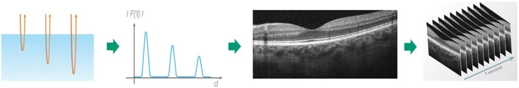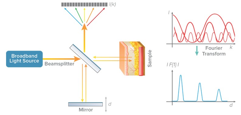 OCT uses low-coherence interferometry with visible or infrared light in combination with scanning across the sample to generate a series of cross-sectional images or 3D volume. There are several ways low-coherence interferometry can be performed, but two of the most popular ways are swept-source (SS-OCT) and spectral-domain (SD-OCT). Both methods shine laser light of multiple wavelengths on the sample and then measure the different wavelengths of scattered light that are returned, taking a Fourier transform of the spectrum to detect structures at different depths.
