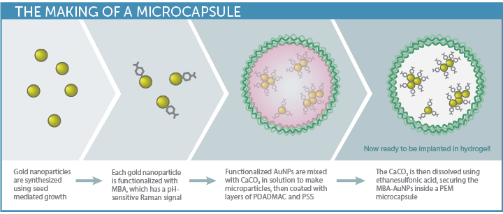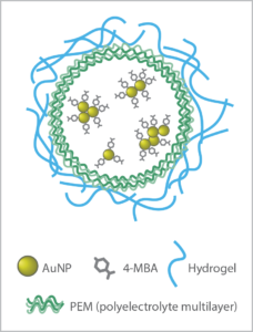 The biosensor approach developed by McShane’s TAMU group begins with gold nanoparticles (AuNP) – plasmonic nanoparticles that enhance the Raman signal. These are functionalized with a Raman probe specific to the analyte of interest, and then enclosed in polyelectrolyte multilayers (PEM) to create capsules.