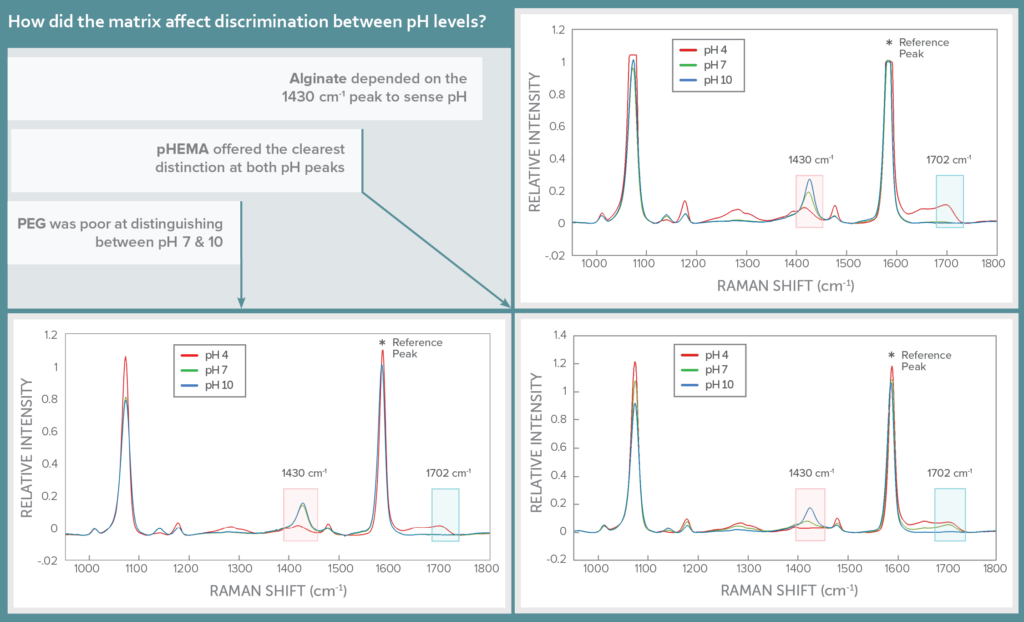 The impact of hydrogel matrix on sensor specificity was assessed by looking at the Raman spectra for each in three pH buffers: 4, 7, and 10. The three hydrogels varied in their ability to distinguish between the pH levels, with pHEMA offering the clearest distinction between the pH levels at both pH-sensitive peaks of MBA. Alginate could distinguish between all three pH levels clearly at the 1430 cm-1 peak, but registered pH 7 and 10 very similarly at 1702 cm-1. PEG was able to distinguish only between pH 4 and higher pH values, but not between pH 7 and 10, ruling it out as a possible hydrogel matrix.