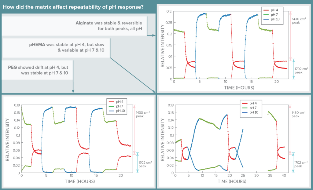 In this test, alginate shone, showing its signal level to be repeatable, reversible, and stable for both SERS peaks as pH level was changed. PEG showed signal drift over time for pH 4, but was more repeatable at pH 7 and 10. In contrast, pHEMA was repeatable for pH 4, but was slower and showed drift in signal in response to changes to pH 7 and 10.