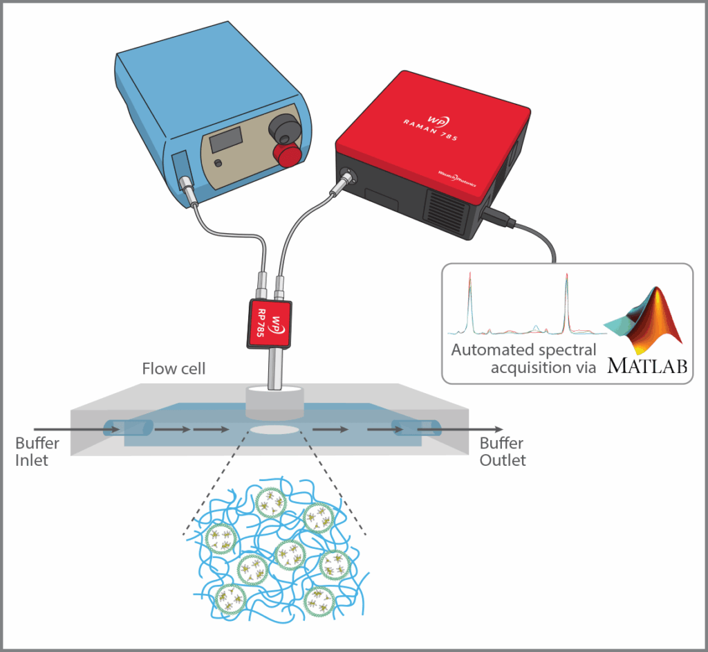A flow cell was used to simulate in-vivo operation, creating a variable pH environment in which the sensor material could be continuously monitored. The detection system employed a WP 785 series Raman spectrometer with 50 µm slit and a TEC-regulated detector set to 10 °C, with a 785 nm fiber-coupled laser for excitation. An RP 785 Raman probe and fiber interfaced with the flow cell to read a disc of hydrogel sensor material. The resulting system covered a range of 270 – 2000 cm-1 in range with 10 cm-1 resolution.