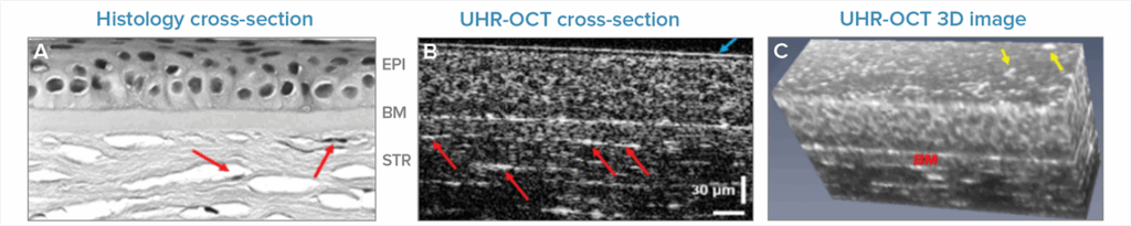 The outer layers of the cornea provide the eye’s first defense against the elements and infection. Here, high-speed UHR-OCT reveals the cellular structure of the epithelial layer, with a bright white line to delineate the boundary with the Bowman’s membrane. Keratocytes, which help to maintain corneal health and facilitate repair, can be seen and counted in the stroma (marked with red arrows). Most incredibly, the tear film is clearly delineated and measurable on the cornea in cross section (blue arrow), and bright spots, likely due to cellular debris and mucin clusters, can be seen in 3D (marked by yellow arrows). This is very promising, as tear film information is lost in histology and IVCM, and has been hard to image using other OCT systems.