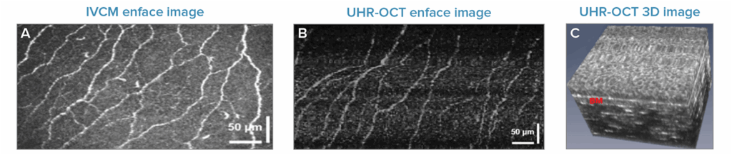 Some corneal pathologies cause changes in the length, twisting, and density of the nerves located in the basal cell layer of the epithelium, running parallel to its interface with the Bowman’s layer. The high spatial resolution and imaging rate of the UHR-OCT system allows these nerves to be imaged in-vivo, seen here as long, reflective white lines. The clarity of the nerves as compared to IVCM was sufficient to allow the research group to develop a fully automated algorithm for segmentation in a follow-on study, indicating potential for in-vivo diagnostics and monitoring of diseases like diabetic peripheral neuropathy.³