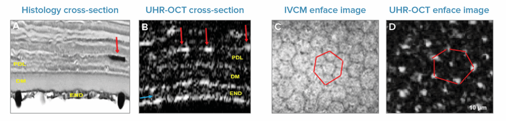 On the posterior edge of the cornea and just beyond the thick stroma lies the pre-Descemet’s layer (PDL) first imaged in-vivo by Bizheva’s group in 2016, also known as the ‘Dua’ layer.4 Below that, the Descemet’s layer and endothelium are the final layers in the cornea. The exact locations of these boundaries are important to the precision of keratoplastic laser surgery techniques. Even at this considerable depth, the high speed UHROCT system provides sufficient resolution to see each structure clearly, including keratocytes at the boundary between the posterior stroma and PDL (bright white spots, marked here by red arrows). Looking at the corneal endothelium layer enface, it is even possible to see reflections from the nuclei (white spots in the UHR-OCT image), as well as their hexagonal pattern (marked in red). This is quite incredible given that these en-face images were generated from 2.8 seconds of data from in-vivo scans!