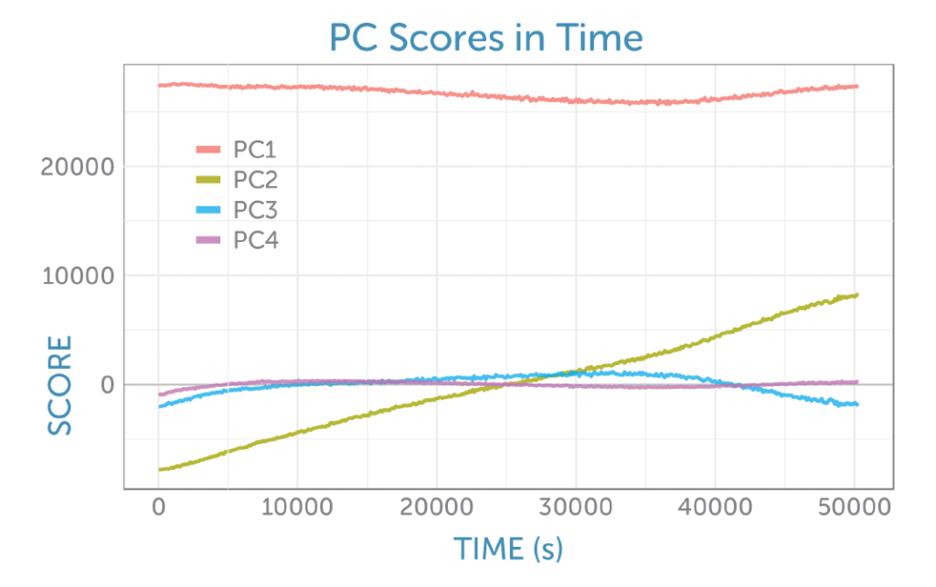 Four principal components were identified, each rich in information about the reactants and products. The PCA scores as a function of time are shown in figure 6.