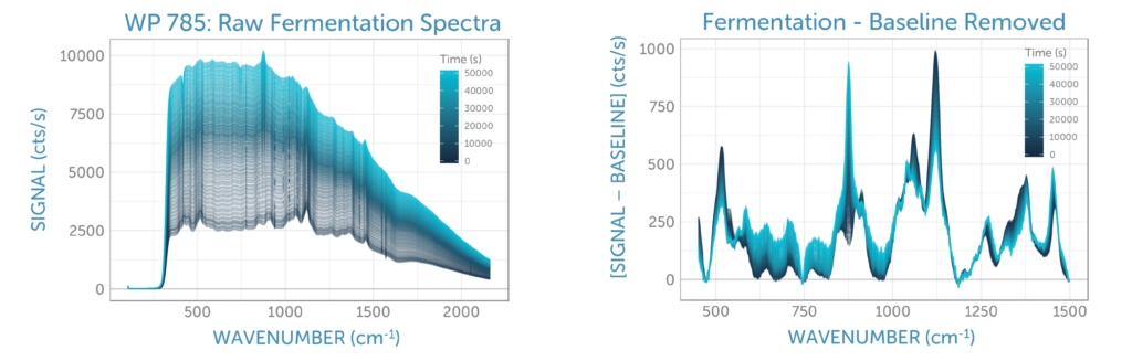 We continuously monitored the Raman spectra of the fermentation sample for 14 hours, taking spectra every 120 seconds. The sequence of unprocessed spectra plotted in figure 4a show a transformation of spectral features over time as glucose was consumed by the yeast and ethanol was generated. The relative changes and the overall signal quality are more clearly visible after removal of the yeast fluorescence background using ALS (asymmetric least squares), as shown in figure 4b.