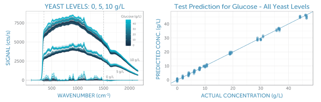 Using a modular 785 nm Raman system fitted with an immersion probe, we continuously recorded spectra during a 14-hour fermentation of glucose with yeast. Using a PLS regression model for the glucose concentration in the presence of yeast we quantitatively monitored the decrease in glucose during fermentation with high signal to noise.