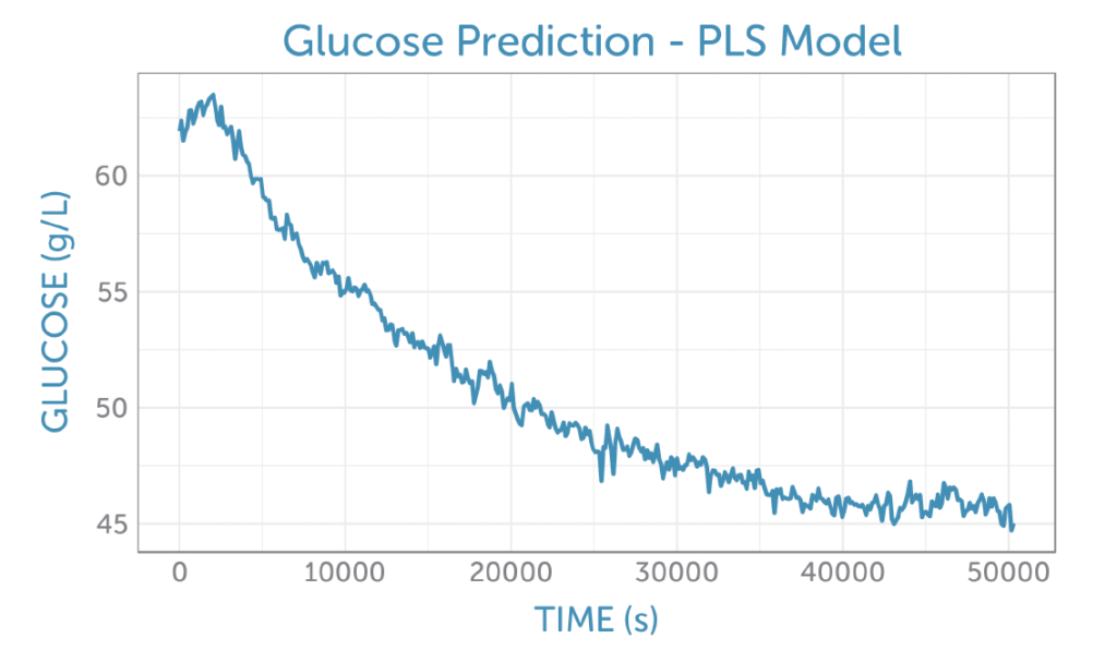 Applying the PLS glucose calibration model to the unprocessed fermentation spectra as they were captured, we were able predict the glucose concentration in real-time during the fermentation, as shown in figure 5. No offline reference measurement was available for validation of the accuracy, but the prediction shows a low noise level for the concentration measurement.