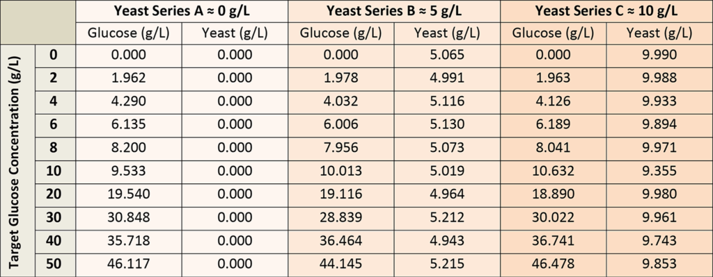 A total of 30 calibration solutions were used to establish the glucose concentration model, prepared from stock glucose and yeast solutions to represent all possible permutations of glucose concentration (0-50 g/L) and yeast (0-10 g/L), as shown in Table 1. The glucose solutions were allowed to equilibrate via mutarotation prior to the calibration measurements.