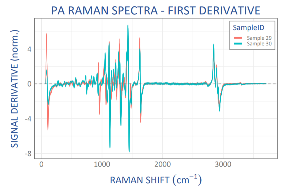 Using derivative spectra focuses the matching algorithm on the edges of the vibrational bands and yields intrinsically high sensitivity to even slight spectral differences between any two spectra. This in turn, however, also requires excellent wavelength stability of the spectrometer, a hallmark of the Wasatch Photonics spectrometer design.