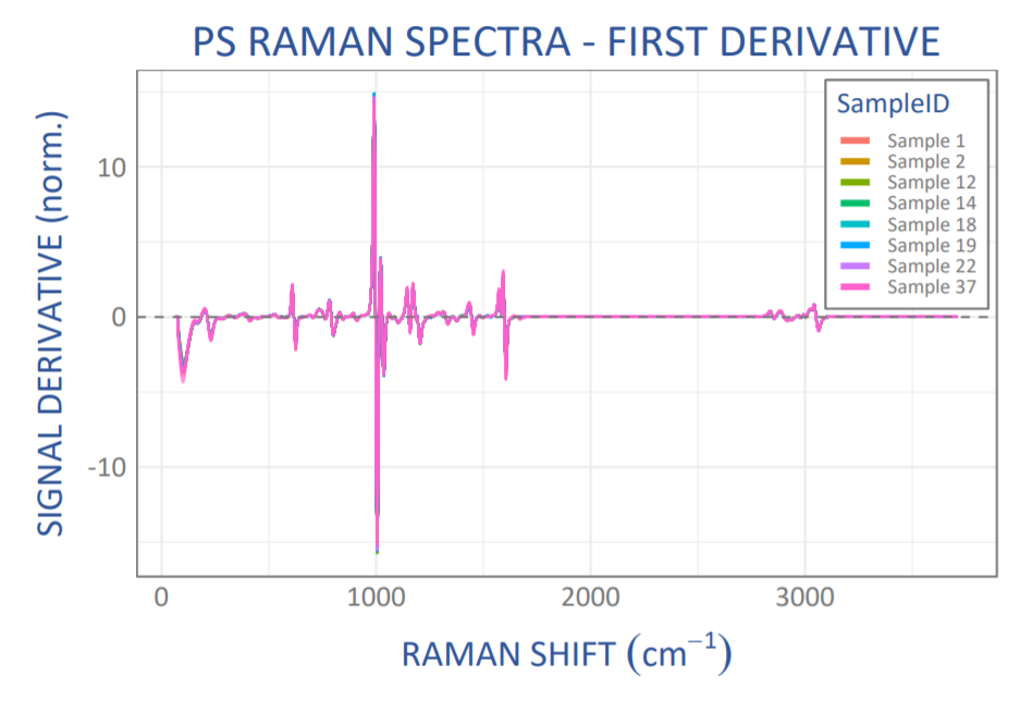 As the first step in analysis, we calculated the first derivative of each spectrum. Looking at the first derivative of a spectrum draws out its key features and accentuates small differences between nearly identical spectra. It can be used to find exact peak locations, which appear as zero-crossings in the first derivative. Peak widths in the original spectrum translate into peak height in the first derivative, with narrower peaks showing larger amplitudes in the first derivative. Use of the first derivative in analysis also helps correct for background signal and facilitates multicomponent analysis. Differentiation and smoothing are often combined into a single algorithm such as a Savitzky-Golay filter for best results.