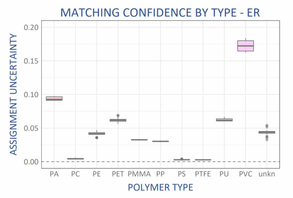 The polymer types with the largest uncertainty were those known to have chemical variation within their families (PA and PVC), as discussed above. All other polymer types showed >86% confidence in matching; those with unambiguous chemical structure, such as PC, PS, and PTFE yielded exceptionally high confidence in the spectral match, >98.5%.