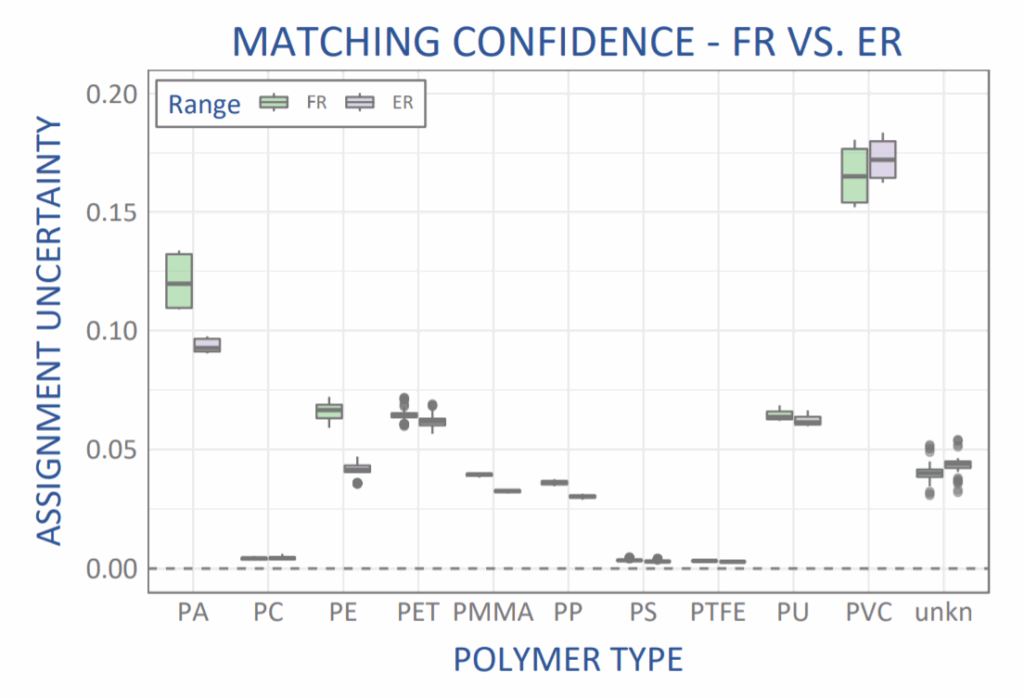 Even for the non-contaminated samples used in the present study, we noticed a (statistically) significant improvement for most polymer types, with an increase in matching confidence between 10 and 25% for most polymer types. Polyethylene showed the largest improvement in confidence; the matching uncertainty is almost cut in half. With a chemical structure that only features C-H and C-C bonds, the polyethylene vibrational spectrum is sparse in the fingerprint region, but features a prominent CH-stretch peak around 3000 cm-1, which most likely leads to this marked improvement in matching confidence. The improvement in matching confidence for these 10 polymers as a group validates the benefit of using extended range for the identification of plastic types in recycling, even when the spectra used in each case is highly reproducible, and with excellent SNR.