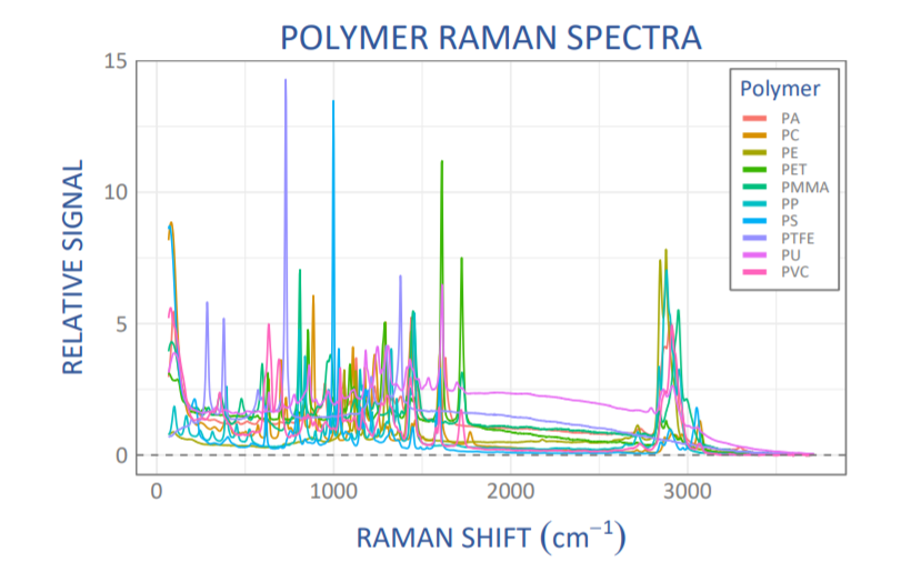 To demonstrate the capabilities of Raman spectroscopy to distinguish specific plastic types, we recorded Raman spectra from a variety of everyday plastic items composed of 10 of the most common plastic material types, using them to develop a model for identification of plastic type based on Raman spectroscopy.