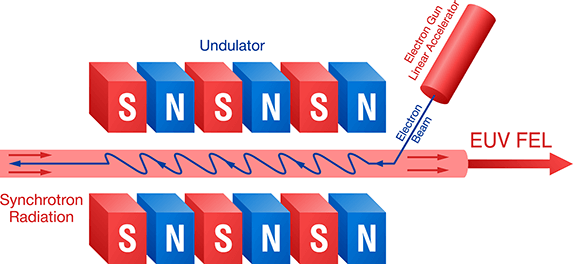 An FEL begins by using an electron beam moving through a periodic magnetic field to generate synchrotron radiation. This light then re-interacts with a ‘bunch’ of electrons within an undulator of opposing magnetic poles to stimulate coherent emission analogous to the amplification that occurs in a laser cavity. This method can be used to generate light as short as a few nanometers, with pulse lengths less than 100 fs.
