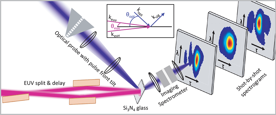 In XFROG, the transient grating created by the crossed beams can then be used to diffract an optical probe beam of visible light at 397 nm much in the same way light is diffracted by a WP holographic grating, collecting information about the glass material response and the EUV pulse in the process. This information-rich visible light is much easier to detect and interpret with an imaging spectrometer.