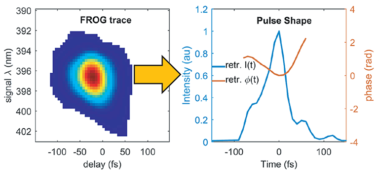 By tackling each limitation in turn and modifying conventional FROG pulse measurement techniques, the team was able to transfer the FEL pulse measurement to more easily detected visible wavelengths, and also sharpen the time resolution to a fs time scale. The diffracted optical probe beam generated could then be spectrally resolved using another Wasatch Photonics grism and imaged onto a detection camera. The resulting FROG trace with spectral information along one axis and time delay between the EUV beams on the other axis provided all the information needed to mathematically reconstruct the characteristics of each individual pulse, from optical spectrum to its temporal pulse shape and phase.