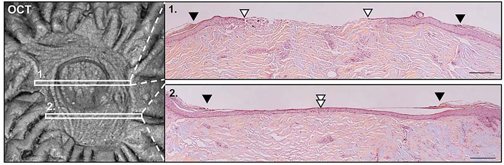 The primary drawback of this model is that assessment has traditionally required destruction of the wounds to evaluate the healing process via histologic examination (HE). Multiple identical wounds must be made to study a single wound type or therapy, carefully sectioning and staining each in turn for examination under a microscope at various time points to see how far the epithelial tongue has grown from the wound edge to cover the exposed dermis. OCT, in contrast, allows the same wound to be monitored non-destructively from start to finish, eliminating variability between tissue samples and individual wounds. This is particularly relevant given that wounds tend to heal unevenly, closing more quickly at some edges than others.