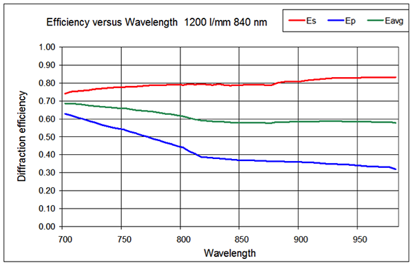 Higher density surface relief gratings have a problem with Polarization Dependent Loss (PDL). As the frequency of the grating increases, P polarized light losses diffraction efficiency (DE). Fig 3 is a high efficiency SR grating with a line spacing of 1200 l/mm. P polarized light falls off as the wavelength increases.