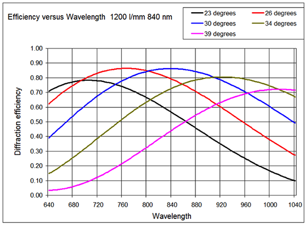Another advantage of volume phase gratings is the ability to change the angle of incidence to favor an area of the spectrum for higher efficiency. Fig 5 shows how the 1200 l/mm grating efficiency curve changes as the angle of incidence is changed through a series of angles.