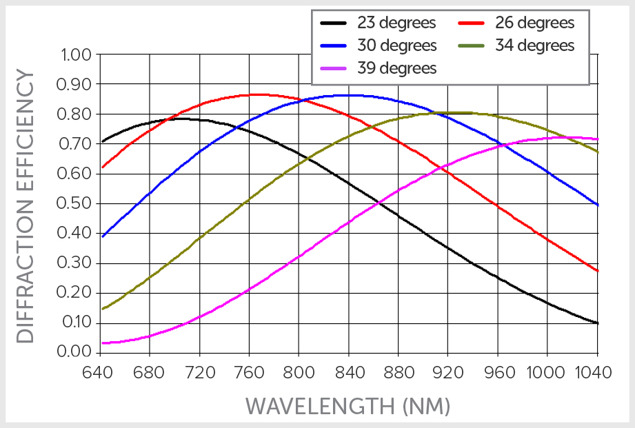 The transmissive, holographic nature of our VPH gratings allows them to operate at high peak diffraction efficiencies, ranging from >80% for a 200-300 nm bandwidth to >99% for a single wavelength for Bragg conditions. This is up to 40% greater than reflective surface relief gratings, which can have very jagged, asymmetric efficiency profiles that wreak havoc with system response. A VPH grating’s efficiency varies smoothly with wavelength, and can be modeled at the design stage for inclusion in system performance models, and then manufactured dependably based upon that design.