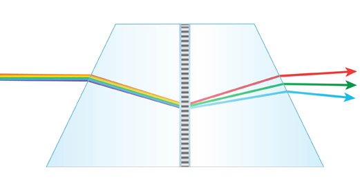 A grating sandwiched between two prisms is called a grism. This compound optic separates light into its components while canceling out the beam deviations caused by each element. Grisms can be used to either create a straight pass dispersive optic or an optic with dispersion higher than is possible with a grating alone. They are convenient for use in imaging, astronomy, spectrally encoded confocal microscopy, and other applications. Learn more about grisms.
