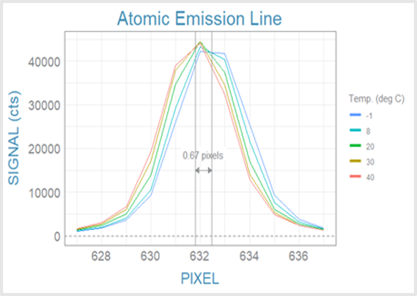 A portable Raman spectrometer needs to perform reliably in a variety of different use-case environments, providing consistent spectral data from one day to the next – independent of changes in temperature and movement. We use a transmission-based optical design known to minimize wavelength drift and peak distortion with temperature, as demonstrated below. We also perform shock and vibration testing to ensure our designs are mechanically robust.