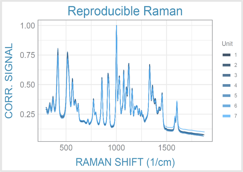 Analysis of Raman spectra often involves matching to a library or use of chemometric models. This makes low unit-to-unit variability important, especially for OEMs. At Wasatch Photonics, we pride ourselves on high unit-to-unit consistency, and we are committed to providing the appropriate wavelength, wavenumber, and spectral response calibrations and standards to ensure rock-solid spectra. This allows you to achieve better than >99.5% unit-to-unit spectral agreement using Wasatch Photonics spectrometers, as demonstrated by the spectra from seven separate spectrometers overlaid above.  Learn how to collect reproducible Raman spectra