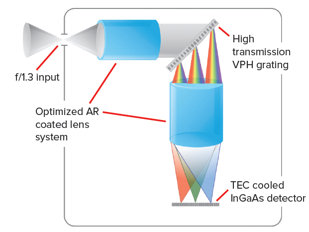 Wasatch Photonics’ Raman spectrometers and systems make use of our patented volume phase holographic (VPH) gratings, which offer much greater transmission efficiencies than standard surface relief gratings while also achieving excellent spectral resolution. This is combined with Littrow configurations for the detection scheme to ensure good focusing at all wavelengths on the full detector range to improve resolution and detection efficiency.