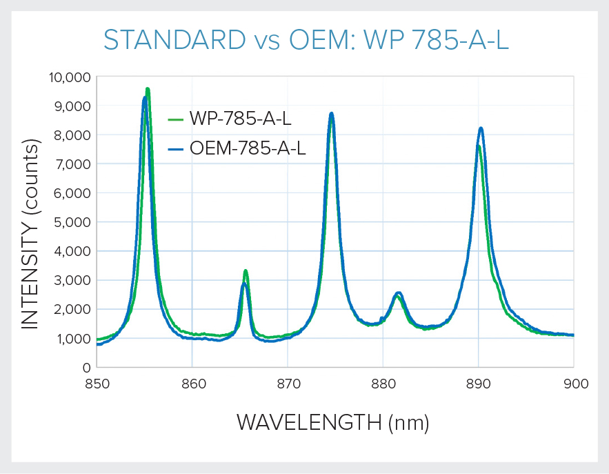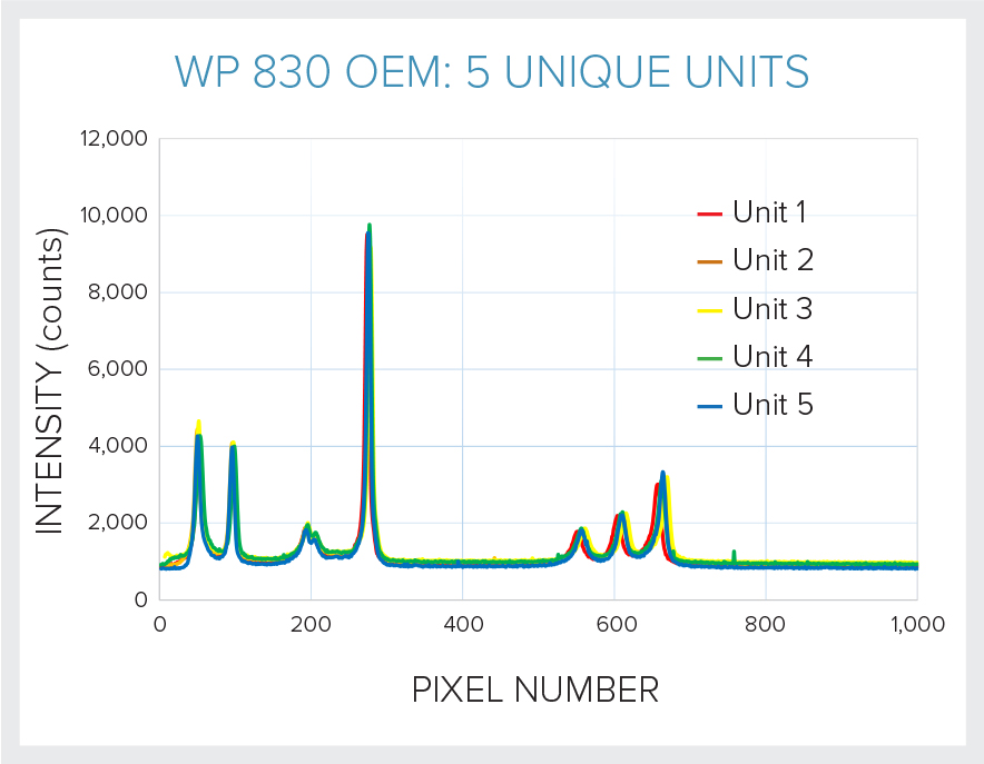 The primary concern OEMs have when migrating to a smaller spectrometer footprint is performance. Photons are precious, particularly in Raman and NIR spectroscopy, which is why our standard and OEM products use the same high performance optical bench to capture, keep and detect more photons. The consistency of spectral response between our standard and OEM products mitigates the risk and time delays traditionally associated with the OEM prototyping process, and aids transfer of chemometric models or Raman libraries for matching.