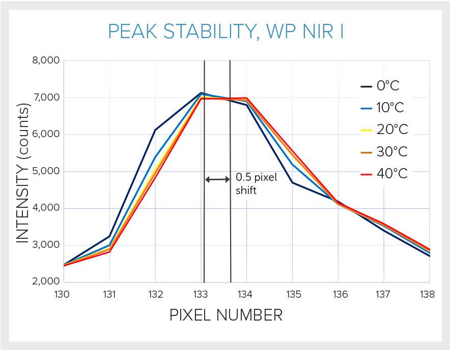 Thermal stability is key in OEM spectrometers, as temperature can influence the peak shape, intensity, and centering that are crucial to many analysis algorithms. Our optomechanical design is highly tolerant to temperature changes, maintaining both consistent peak height and shape during temperature cycling. We see <0.5 pixels of thermal shift over 0-40ºC for our OEM NIR spectrometer, and just 2 pixels for the WP 785 Raman, ensuring accurate analysis and dependable answers over a wide range of operating temperatures.