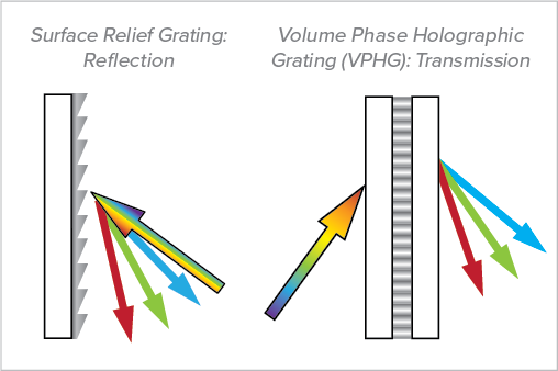 But we can extend the different types of diffraction gratings further to discuss the new and emerging manufacturing techniques for holographic gratings. Etched-in relief gratings comprised of fused silica and volume phase holographic (VPH) diffraction gratings, for instance, are two radically different design paradigms for modern optical systems. While both offer significantly higher efficiency than ruled gratings, VPH grating technology offers the optical engineer more design options to achieve the desired efficiency profile.